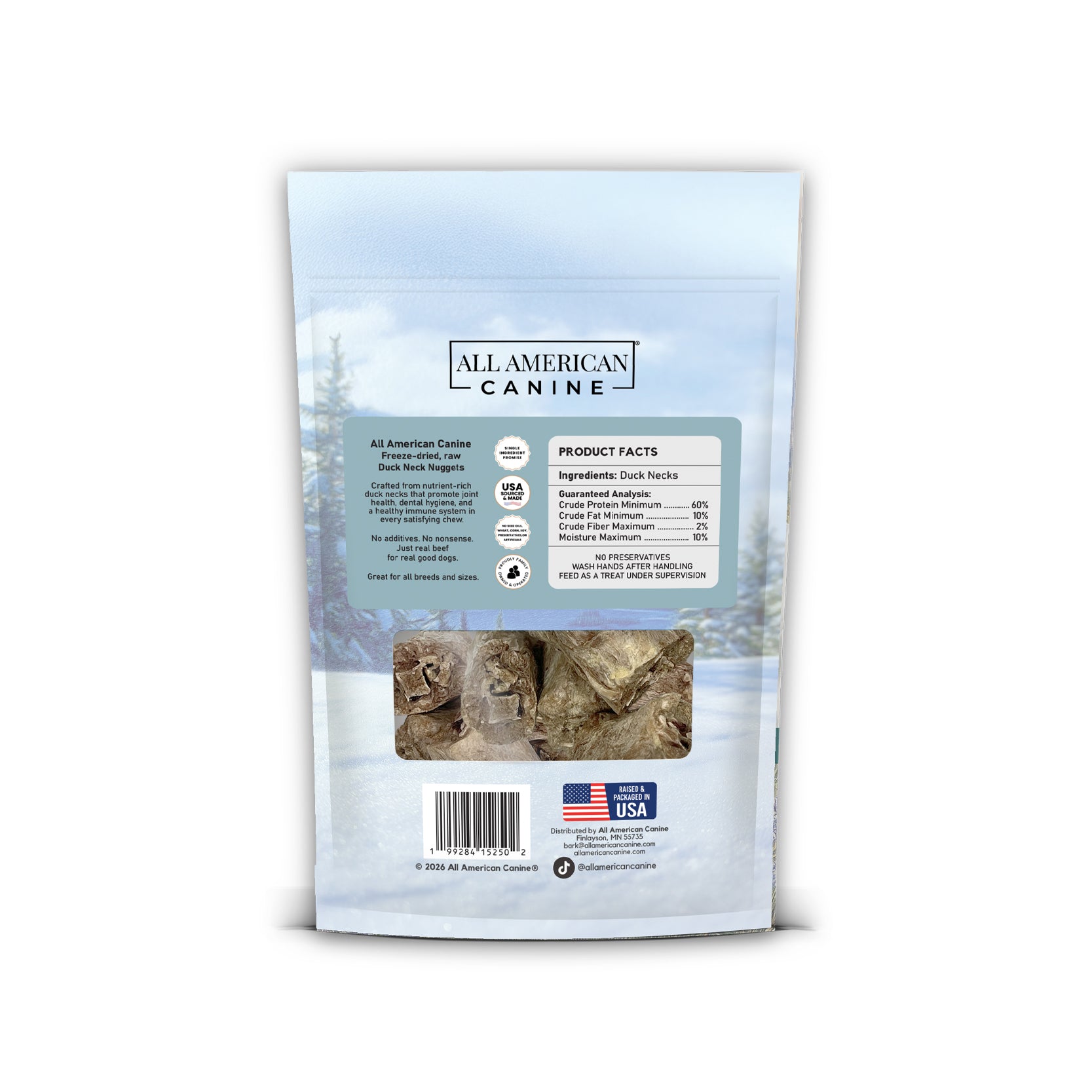 Looking for a nutritious, natural chew that does more than just satisfy your dog’s cravings? All American Canine’s Freeze Dried Duck Necks are a single-ingredient, protein-rich treat packed with essential nutrients that support overall health. These dehydrated chews offer a satisfying crunch, natural joint support, and important dental benefits in every bite.