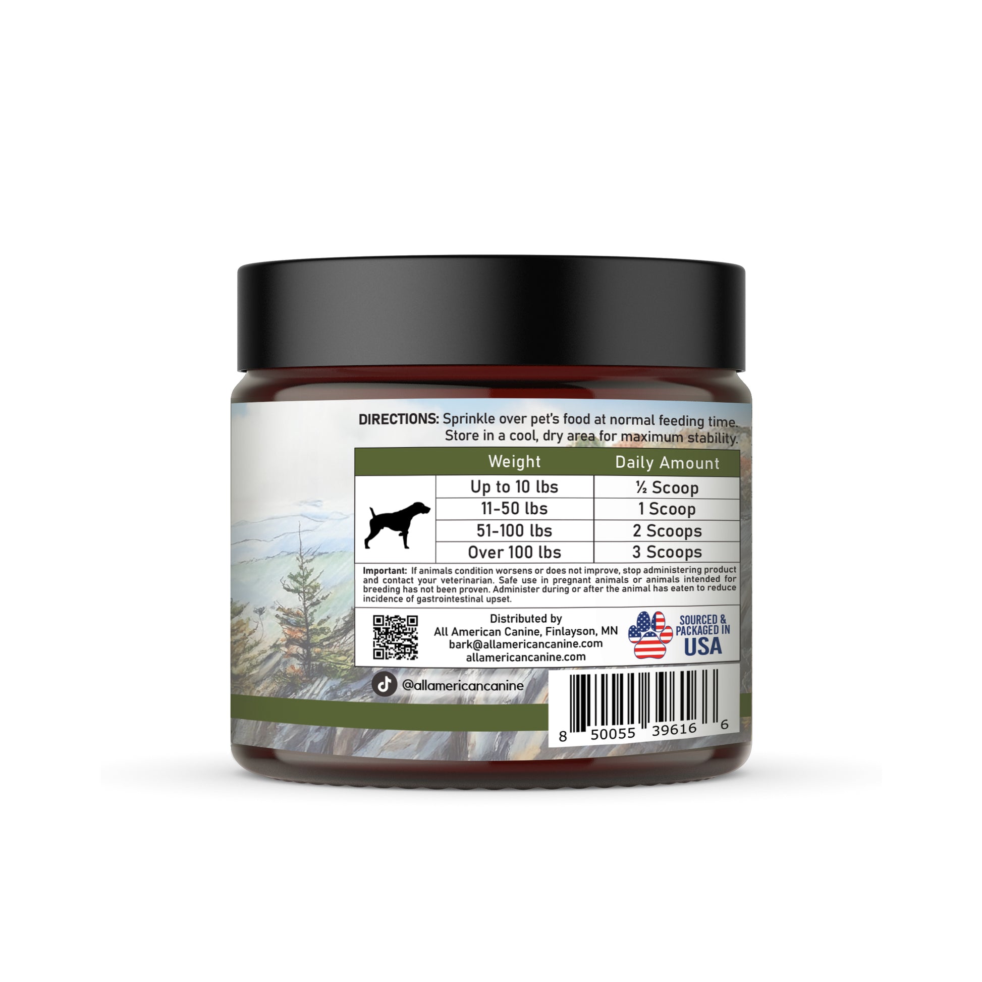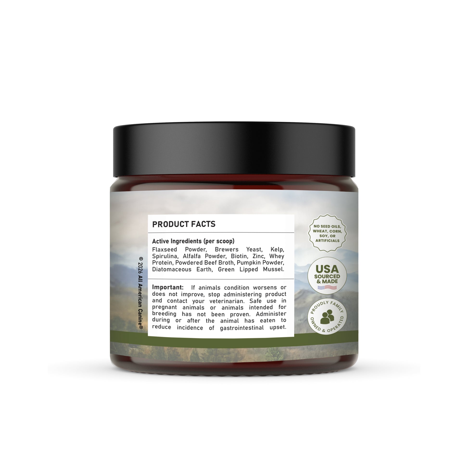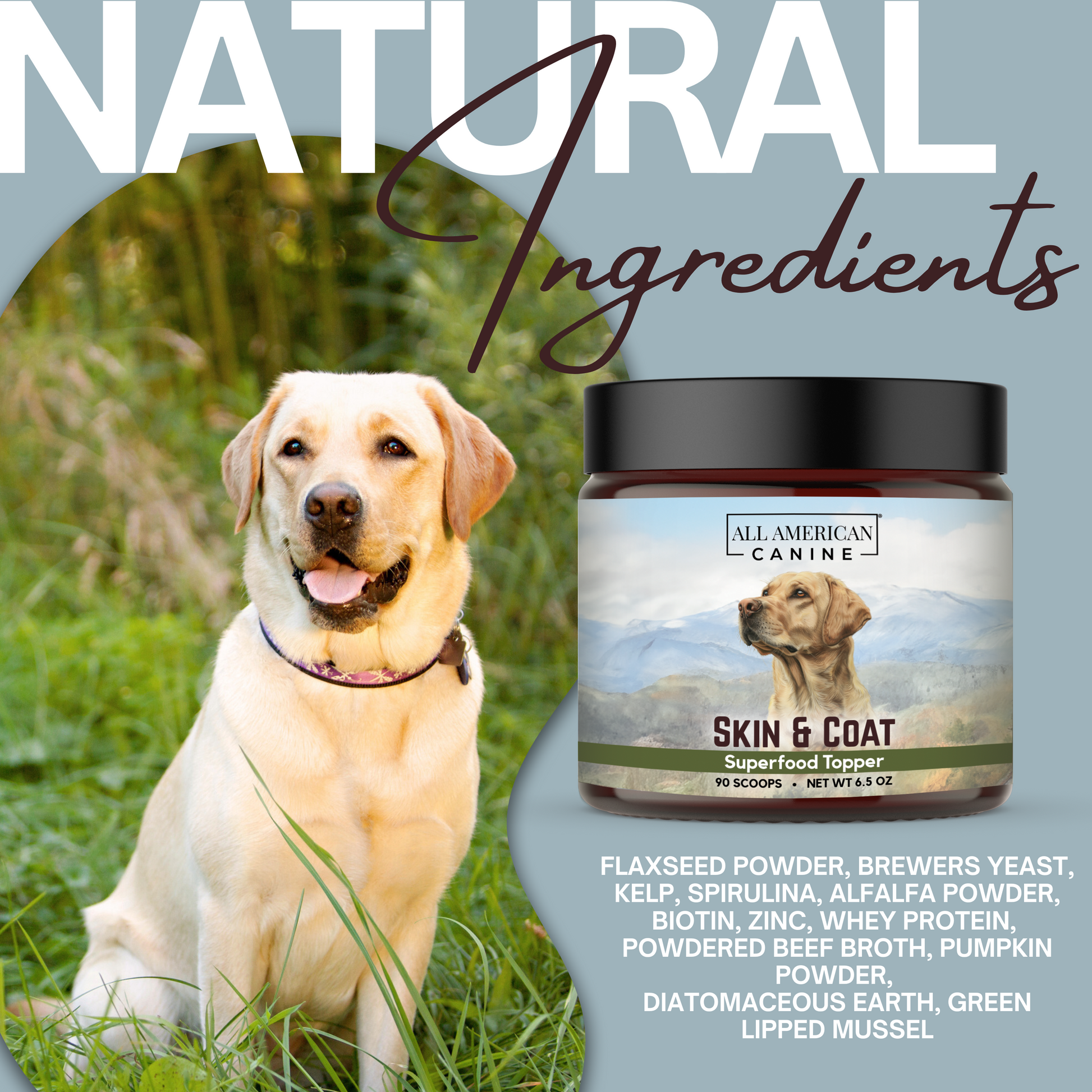 Boost your dog's skin and coat health effortlessly with All American Canine's Complete Skin & Coat powdered food topper - the perfect skin and coat digestive supplement for active dogs and their adventure-loving owners!
